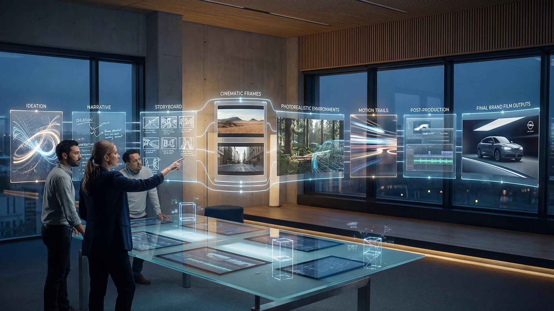 Director-led cinematic pre-production transforms creative intent into a structured visual system. Scenes, compositions, environments, talent presence, product moments and lighting moods are pre-visualized to establish continuity, framing and narrative flow. This serves as a visual bible that prepares execution without generating final footage.