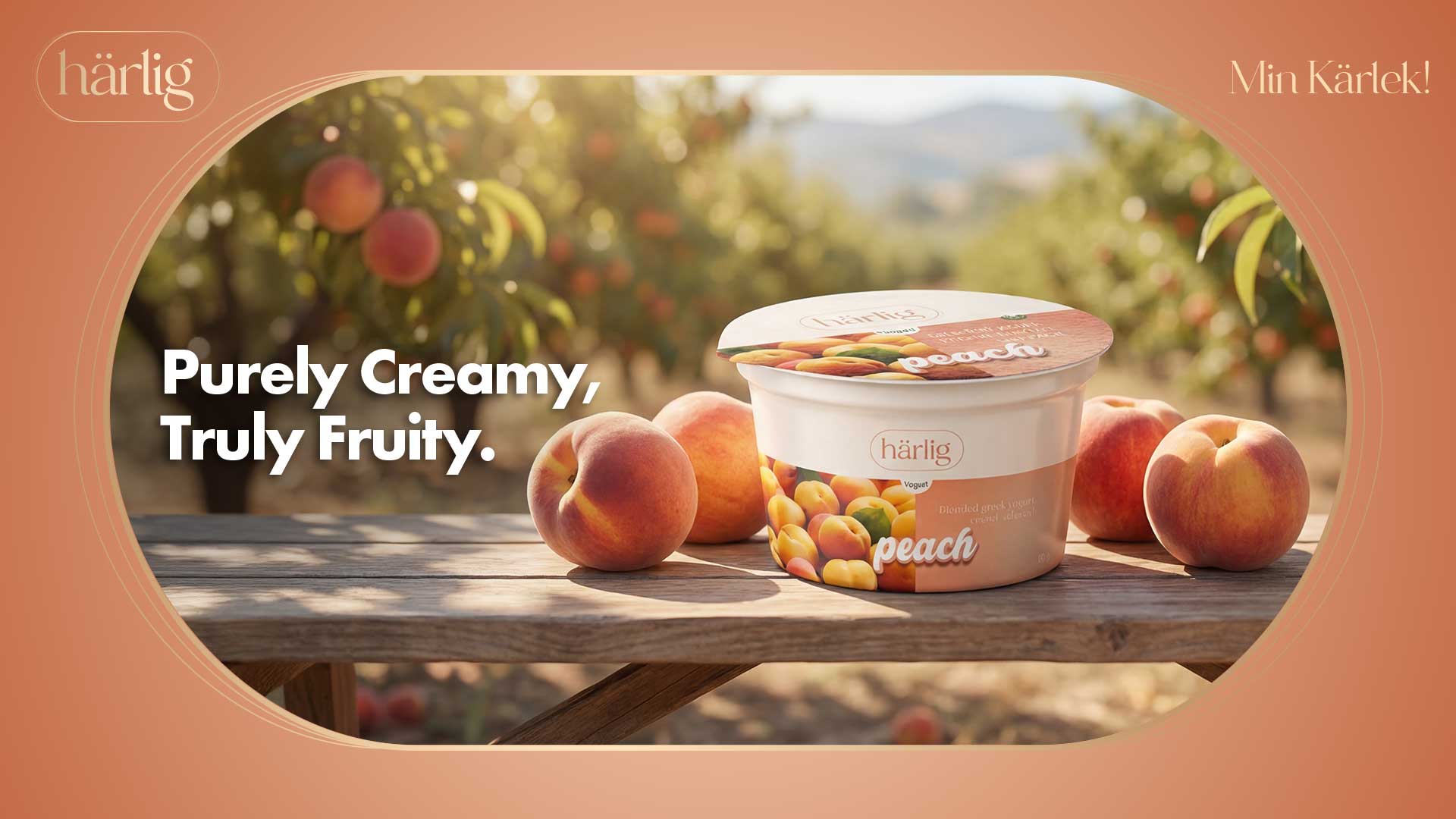 With the first taste of Harlig Greek Peach Yogurt she is gently carried from her lounge into a sunlit peach orchard. Beneath ripened branches on a wooden bench surrounded by warm light she holds her cup and feels the world soften.